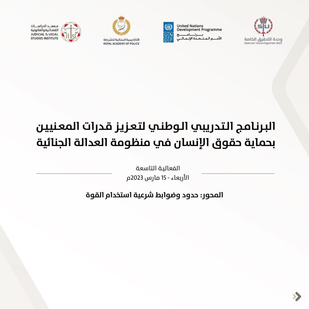 شارك المكتب في الفعالية التاسعة والأخيرة من البرنامج التدريبي الوطني لتعزيز قدرات المعنيين بحماية حقوق الإنسان في منظومة العدالة الجنائية، التي انعقدت في تاريخ 15 مارس 2023م، المنظمه من قبل وحدة التحقيق الخاصة، بالتعاون مع برنامج الأمم المتحدة الإنمائي، والأكاديمية الملكية للشرطة، ومعهد الدراسات القضائية والقانونية، وقيد بينت هذه الفعالية حدود وضوابط شرعية إستخدام القوة القانونية.