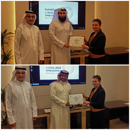 شارك منتسبي مكتب المفتش العام في ورشة عمل نظمتها الأمانة العامة للتظلمات بتاريخ 6- 8 ابريل 2014م بعنوان (( الاعلامي المحترف )) قدمتها السيدة نادية التركي اعلامية وصحافية تكتب في عدة مجالات وتطرقت الورشة الى تعريف الخبر وكيفية صياغته بالسرعة والمصداقية والحيادية وذكرت الاسئلة المهمة التي يجب طرحها لجعل الخبر غير ناقص وكذلك شرحت كيفية الانتقال من كتابة الخبرالى كتابة التقرير والنقاط المهمة التي يجب الاخذ بها لكتابة التقرير.